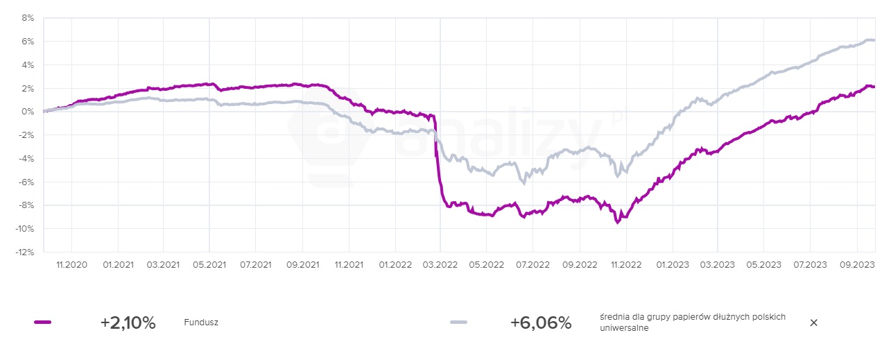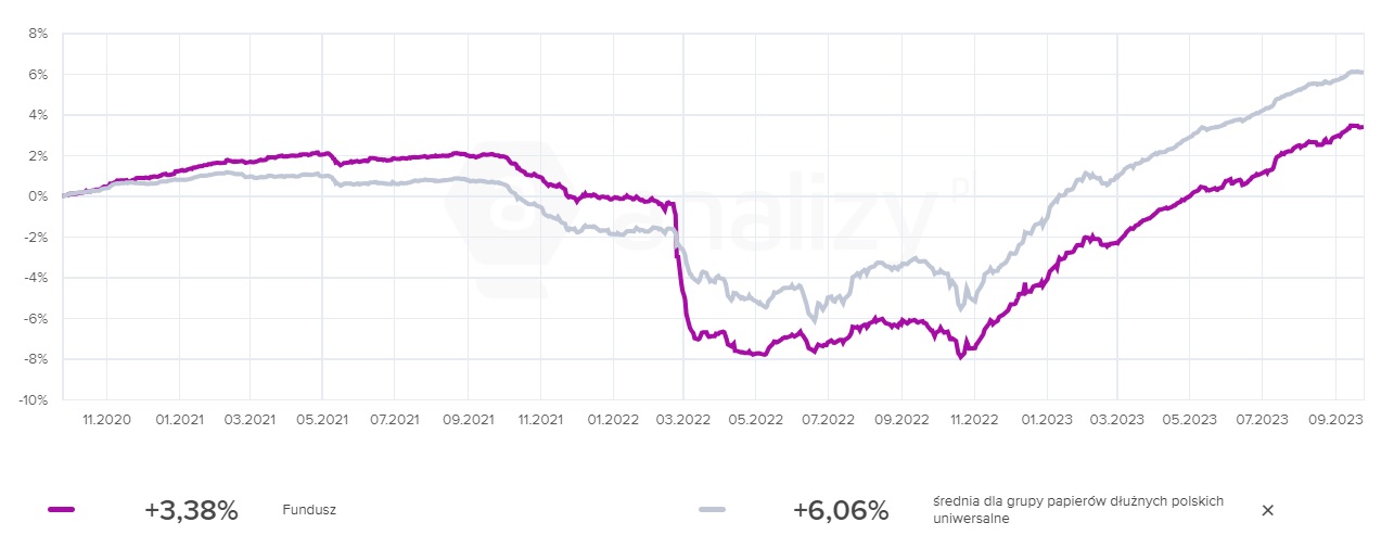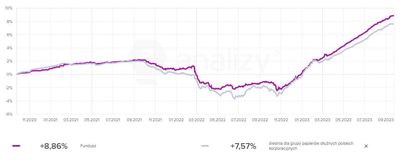Straty "rosyjskie" odrobił też Generali Aktywny Dochodowy. Jest to fundusz dłużny o uniwersalnej strategii, co oznacza, że może inwestować zarówno w obligacje skarbowe, jak i korporacyjne. Na koniec czerwca w jego portfelu znaleźliśmy 8 serii polskich obligacji zmiennokuponowych (WZ), które stanowiły niecałe 47 proc. jego aktywów netto. Ponad 20 proc. zajmowały obligacje inflacyjne (IZ0823), które zapadły w sierpniu. Zagranicznych papierów skarbowych było niewiele (niecałe 6 proc.), głównie krajów naszego regionu (Rumunia, Bułgaria, Węgry). Dwa razy więcej stanowiły natomiast papiery firm z rynków zagranicznych (banki z regionu). Ponad 40 proc. portfela zajmowały z kolei polskie obligacje korporacyjne nieco ponad 30 dużych i rozpoznawalnych emitentów (polskie banki, PZU, Synthos, Orlen, Cyfrowy Polsat, MLP czy Enea. Średnia rentowność (kupon) w tej części portfela nieco przekracza 6 proc. W ujęciu od początku roku fundusz zyskuje 8 proc., o ponad 0,5 pkt proc, więcej niż średnia w grupie. W skali ostatnich 3 lat zarobił 3,4 proc., o niemal połowę mniej niż rywale. Fundusz stosował niewielką dźwignię finansową (lewar).