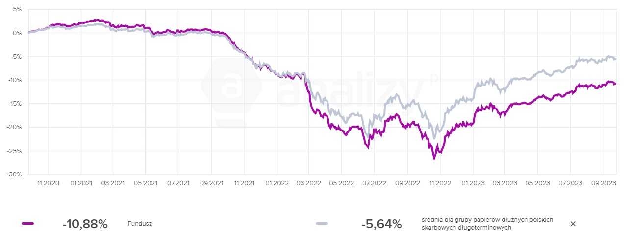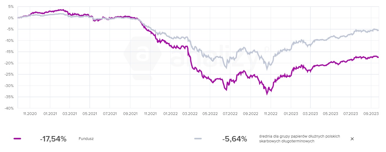 Najgorzej z całej piątki wypada Generali Obligacje Aktywny, któremu jeszcze nie udało się odrobić całości strat i trochę mu do tego brakuje. Fundusz ten również należy do grupy papierów dłużnych polskich skarbowych długoterminowych i w tym roku zyskał ponad 11 proc., dystansując rywali z grupy o 1,3 pkt proc. W skali trzech lat stracił natomiast 17,5 proc. - ponad trzykrotnie więcej niż średnia w grupie.