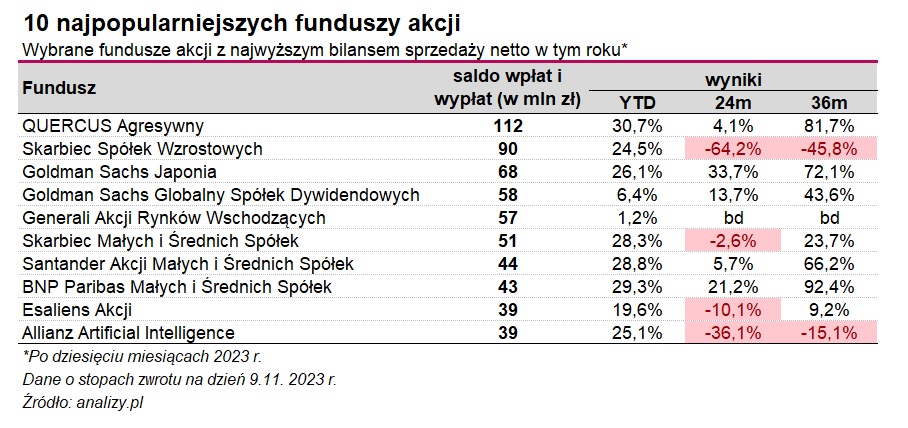 Wybraliśmy 10 funduszy akcyjnych z najwyższym bilansem sprzedaży w tym roku i sprawdziliśmy, jak sobie radzą pod względem wyników inwestycyjnych.