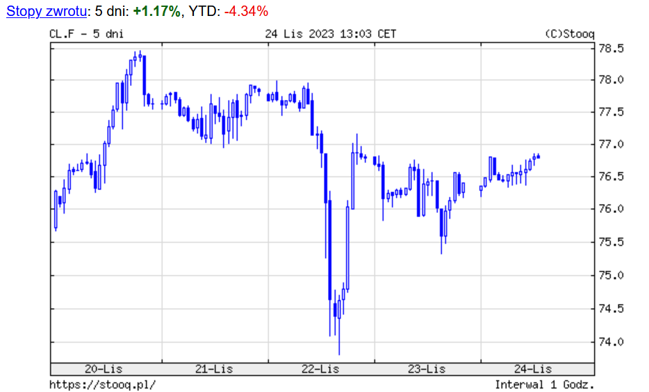 Na świecie osłabiał się dolar, indeksy szły do góry, złoto usiłowało pokonać poziom 2000 dolarów za uncję, a ceny ropy wahały się w oczekiwaniu na spotkanie OPEC+, rosnąc na początku tygodnia, spadając w jego środku i ostatecznie stabilizując się na wyjściowych poziomach ok 76-77 dolarów za baryłkę ropy WTI (teksańskiej). Niepewność co do ewentualnego ogłoszenia cięć wydobycia wzmógł fakt niespodziewanego przesunięcia spotkania kartelu z 26 na 30 listopada.