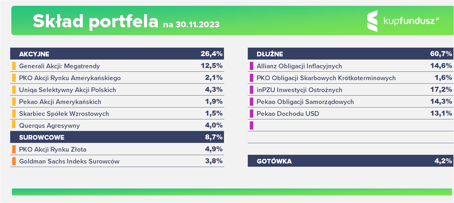 Prognozowany skład portfela RBI na 30.11.2023 (po transakcji, ale z wycenami z 28.10). Przy większych zmianach cen aktywów skład portfela może się nieco różnić.