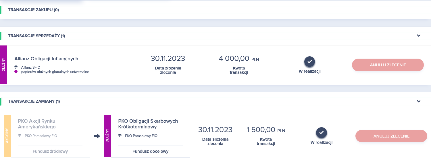 30 listopada, równo po miesiącu od ostatnich zmian, Rafał Bogusławski dokonał transakcji w swoim portfelu. Jeden z funduszy PKO zamienił na inny i zmniejszył zaangażowanie w jeden z funduszy Allianza.