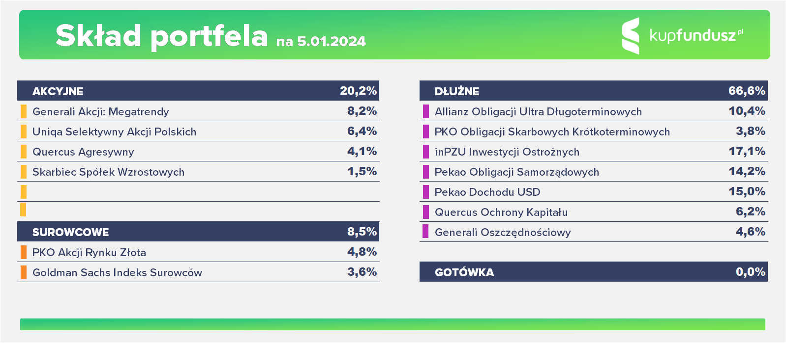 Prognozowany skład portfela RBI na 5.01.2024 (po transakcji, ale z wycenami z 2.01). Przy większych zmianach cen aktywów skład portfela może się nieco różnić.