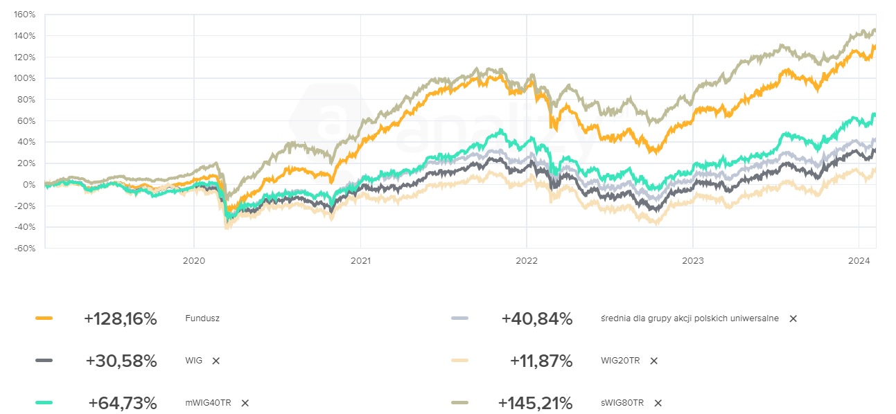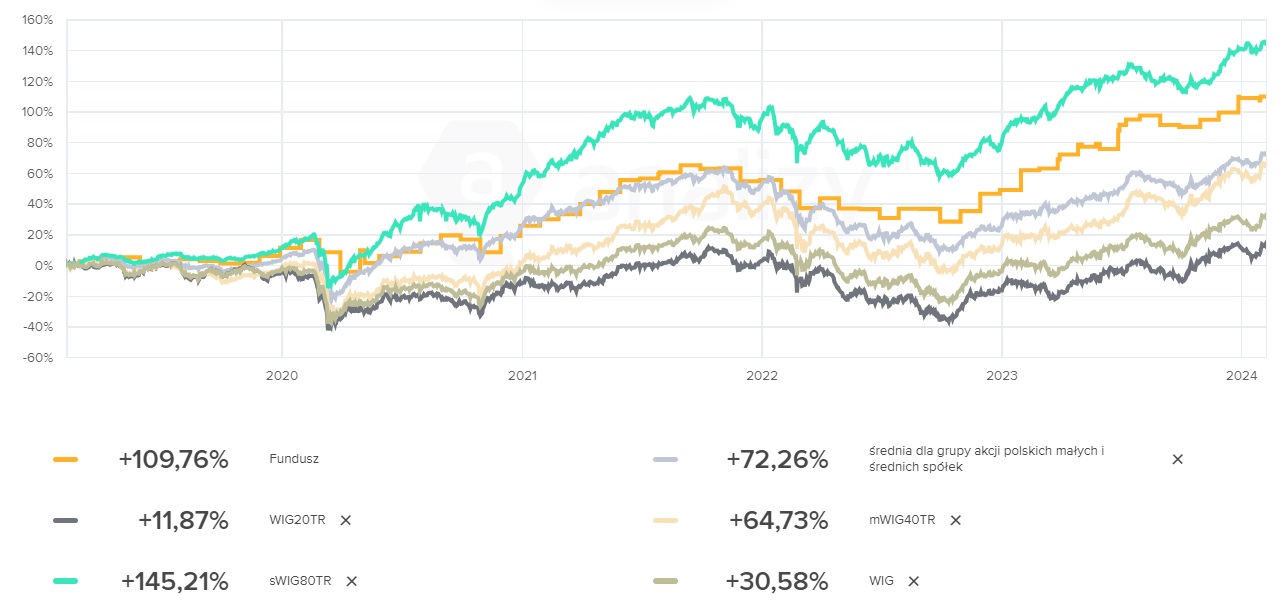 Inwestuje w segmencie małych i średnich spółek z GPW. Jego benchmarkiem jest 100 proc. mWIG40 TR. Na koniec grudnia największy udział w portfelu miały firmy z sektora finansowego i przemysłowego oraz dób dyskrecjonalnych. Wśród największych pozycji były CCC, Bank Millennium, GPW, XTB oraz Inpost. Przez ostatnie 5 lat fundusz zarobił ponad 140 proc., w tym czasie mWIG40 TR wzrósł o 65 proc. Skarbiec Małych i Średnich Spółek jest trzykrotnym zdobywcą nagrody Alfa, przyznawanej przez Analizy Online. To wyróżnienie fundusz zdobył za wyniki wypracowane w 2018, 2019 oraz 2020 roku. Słabsze miał lata 2021 i 2022 kiedy plasował się poniżej średniej, ale w ubiegłym roku wrócił do formy, zyskując ponad 41 proc., co było szóstym najlepszym osiągnięciem w grupie. W Skarbiec Małych i Średnich Spółek również można zainwestować od 100 zł. Koszty bieżące wynoszą 2,3 proc.