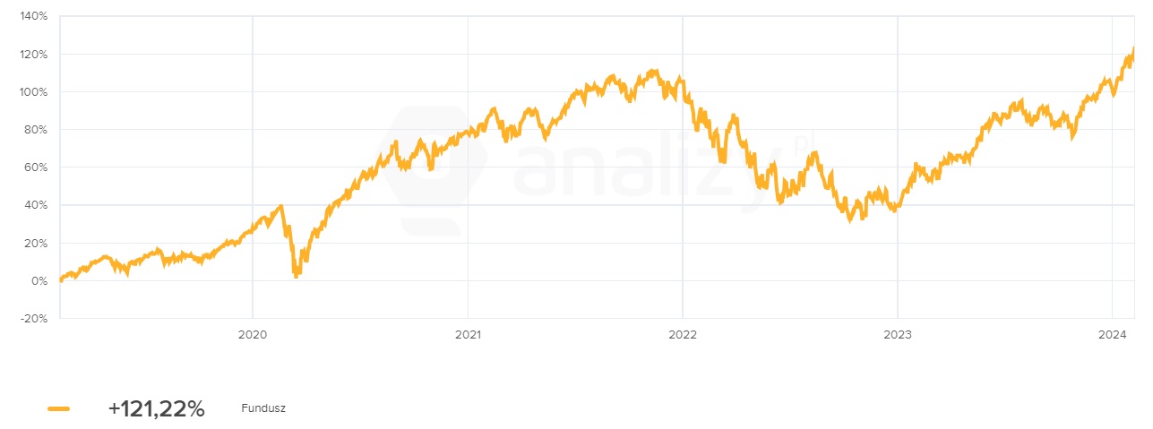 Santander Prestiż Technologii i Innowacji jest jedynym funduszem akcji zagranicznych w tym zestawieniu. Co najmniej 60 proc. swoich aktywów inwestuje w spółki z sektorów tzw. nowoczesnych technologii tj. m.in. sektora informatycznego, internetowego, telekomunikacyjnego, medialnego, biotechnologicznego. Jest aktywnie zarządzany i porównuje swoje wyniki do benchmarku zbudowanego z 40 proc. MSCI World Information Technology Net TR USD + 30 proc. MSCI World Communication Services Net TR USD + 25 proc. WIGtechTR + 5 proc. WIBOR O/N. Na koniec grudnia ubiegłego roku wśród największych pozycji w portfelu znajdowały się akcje znanych spółek technologicznych, m.in. Microsoft, Alphabet, Meta Platforms, Advanced Micro Devices oraz Nvidia Corp. Przez ostatnie 5 lat fundusz zyskał ponad 121 proc. Dostępny jest od 100 zł. Opłaty bieżące wynoszą 2,18 proc.