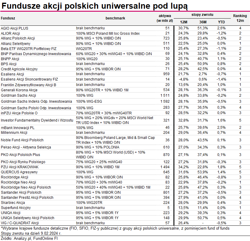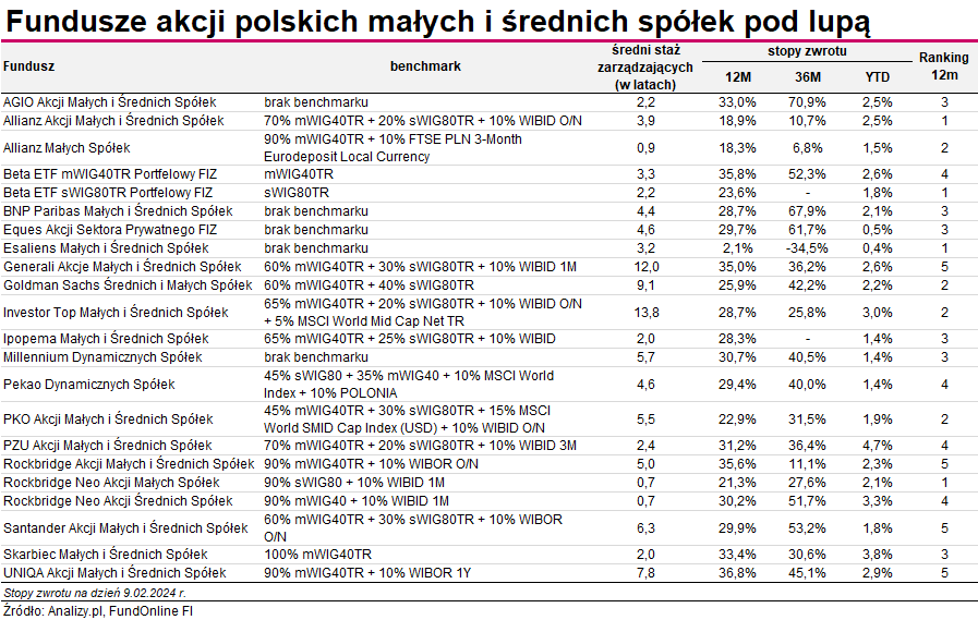 Fundusze akcji polskich podzielić możemy na takie, które stosują uniwersalną strategię, zatem inwestują na szerokim rynku GPW. W ofercie krajowych TFI znajdziemy także fundusze akcji małych i średnich spółek. Te okazji do zarobku poszukują wśród firm o małej i średniej kapitalizacji, skupionych najczęściej w indeksach mWIG40 i sWIG80. Myli się jednak ten, kto myśli, że przynależność do którejś z wymienionych grup wystarczy, aby ocenić strategię danego funduszu. W ramach tej samej „rodziny” wstępują bowiem spore różnice.