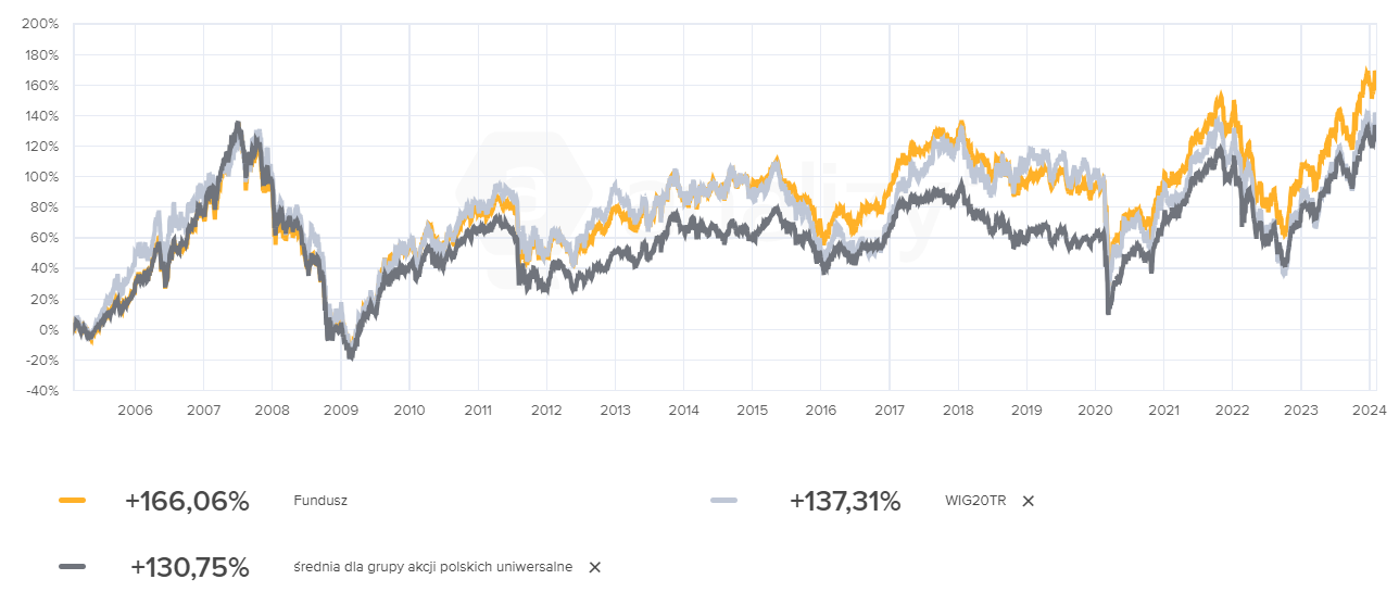 Niezwykle istotna jest też alokacja sektorowa. Część funduszy przeważa banki, inne stawiają mocniej na sektor handlowy, a jeszcze inne okazji szukają w branży technologicznej. Inwestując w fundusz akcyjny aktywnie zarządzany, decyzję o tym, które spółki kupować, w jakich proporcjach, a także jaki segment GPW w danym momencie przeważać, podejmuje zarządzający. Robi to, aby generować tzw. alfę, czyli stopę zwrotu ponad swój portfel wzorcowy (np. WIG). To różni aktywne fundusze od ETF-ów i pasywnych strategii indeksowych, które nie ścigają się z rynkiem, lecz mają za nim wiernie podążać. Zarobią (lub stracą) więc dokładnie tyle, ile naśladowany wskaźnik (np. WIG20TR).
