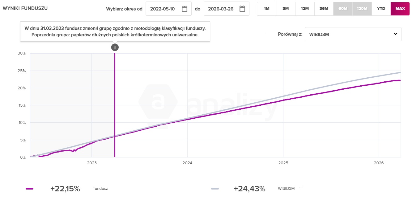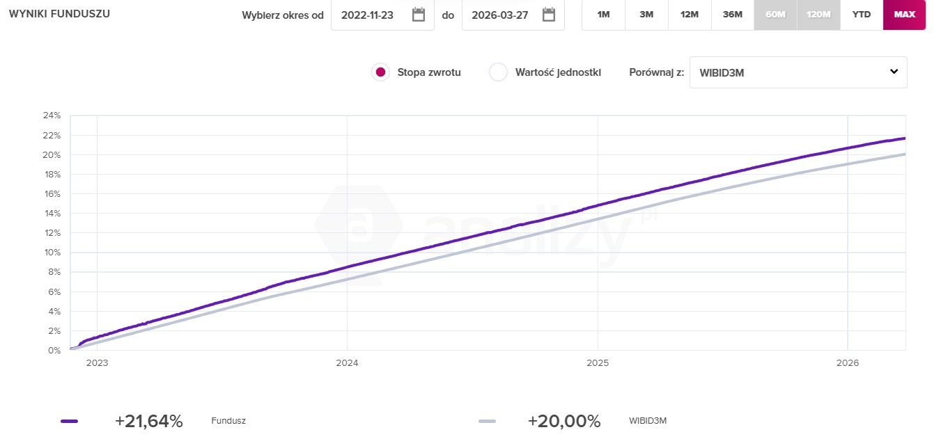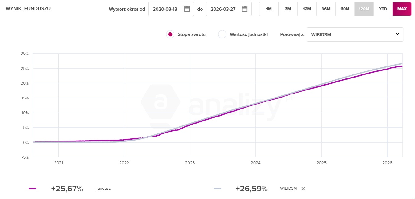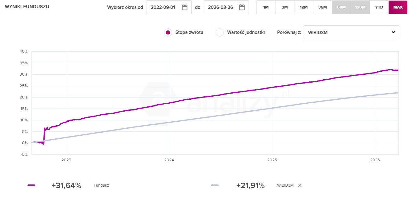 Od początku stosowania obecnej polityki inwestycyjnej fundusz zarobił 22 proc., o 2 pkt proc. mniej niż WIBID3m. W 2025 roku zyskał 4,25 proc., rok wcześniej niecałe 5 proc. Licząc od początku 2026 r., jest 0,7 proc. na plusie.