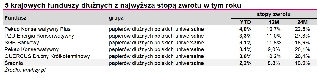 Najzyskowniejsze fundusze dłużne w tym roku inwestują w polskie obligacje krótkoterminowe. Zarobiły na nich od stycznia już ponad 3 proc. Lider powiększył portfele o 4 proc. Na dalszą część roku zarządzający prognozują kontynuację dobrej passy.