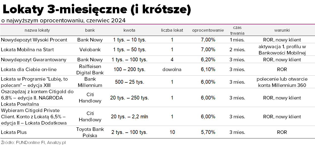 Jeśli chcemy powierzyć bankowi swoje pieniądze na nie dłużej niż trzy miesiące, możemy liczyć na najwyżej 7% w skali roku. Nie jest to zły wynik, zważywszy na fakt, że inflacja wynosi obecnie 2,5% rok do roku (maj 2024). Za dobrą monetę można też przyjąć fakt, że obie oferty obejmują okres krótszy niż trzy miesiące, z zarobku będzie można więc skorzystać jeszcze przed rozpoczęciem nowego roku szkolnego. Wady? Kilka warunków założenia depozytu i niewielkie nominalnie kwoty po odliczeniu podatku Belki.