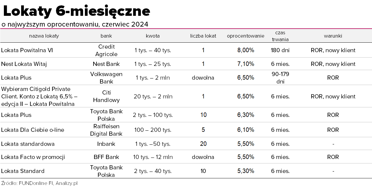 Nieco wyższych stawek klienci mogą się spodziewać na najlepiej oprocentowanych depozytach półrocznych, choć też obwarowane są one wymogami założenia ROR-u. Najwięcej oferuje Credit Agricole na Lokacie Powitalnej VI – 8% w skali roku. Lokatę może założyć w ciągu 14 dni po otwarciu konta osobistego Konto dla Ciebie, Konto dla Ciebie MOVE! lub Konto dla Ciebie VIP osoba, które nie miała takowego w tym banku w ciągu ostatnich dwóch lat.
