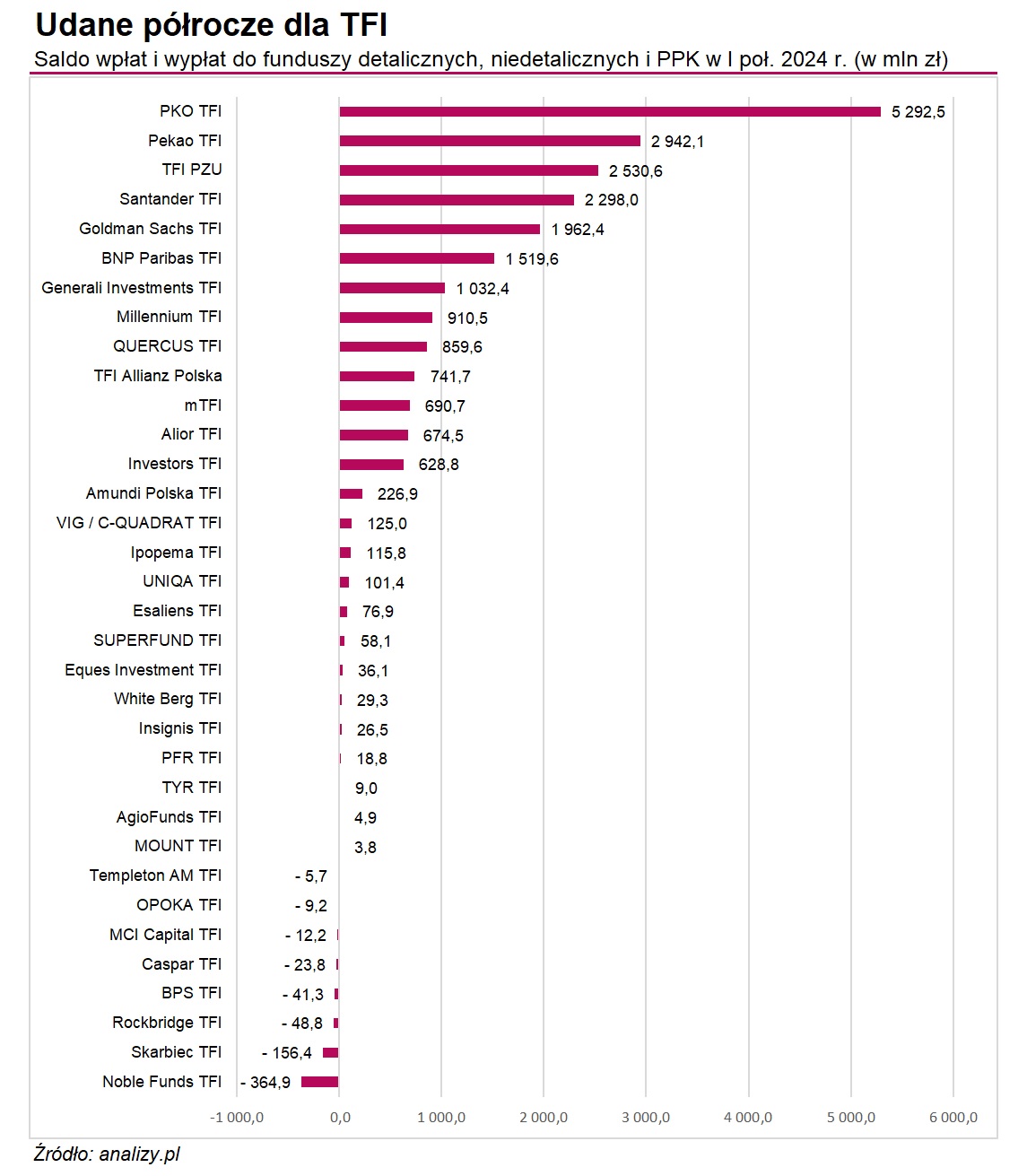 Nie jest zaskoczeniem, że najszerszym strumieniem kapitał płynie do TFI, wspieranych sprzedażowo przez banki. W pierwszym półroczu 2024 trafiło do nich łącznie ponad +16 mld zł. Liderem w tej grupie jest PKO TFI, które w omawianym okresie pozyskało +5,3 mld zł netto. Największą popularnością cieszą się szczególnie 2 fundusze dłużne: PKO Obligacji Skarbowych Krótkoterminowy, który pozyskał niemal 4 mld zł, a także PKO Obligacji Uniwersalny, gdzie trafiło na czysto ponad 1 mld zł. Na przeciwległym biegunie popularności wylądował PKO Obligacji Skarbowych Długoterminowy, z którego klienci wycofali ponad 130 mln zł. Podobne odpływy zanotowały także 2 fundusze akcyjne ze stajni PKO TFI: PKO Dóbr Luksusowych Globalny i PKO Technologii i Innowacji Globalny. Ten ostatni wciąż pozostaje największym detalicznym funduszy akcji na rynku. Na koniec czerwca zarządzał aktywami o wartości ponad 2,8 mld zł.