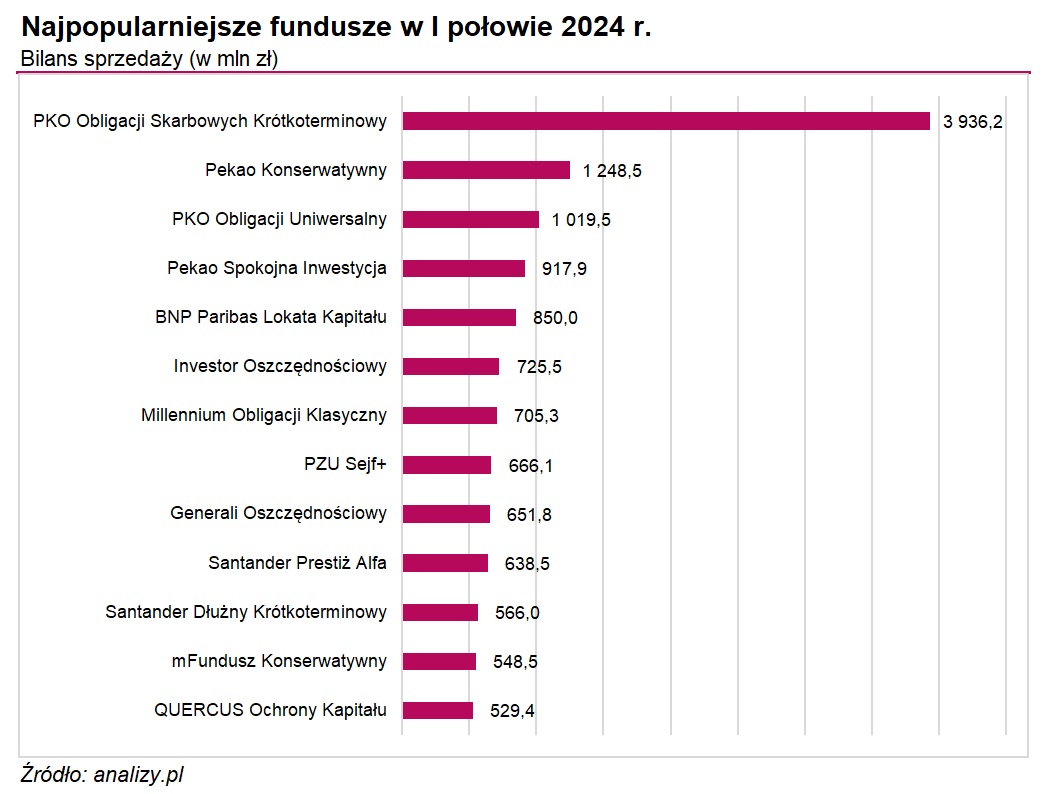 Zestawienie 13 najpopularniejszych pod względem sprzedaży netto funduszy zdominowały rozwiązania dłużne, które łącznie pozyskały w pierwszym półroczu aż 13 mld zł. Liderem jest wspominany już wyżej PKO Obligacji Skarbowych Krótkoterminowy, który pozyskał niemal 4 mld zł.