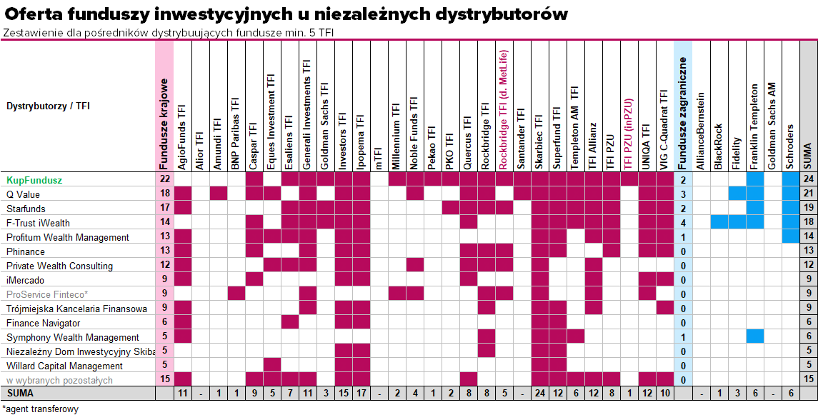 Na tym tle wyróżnia się KupFundusz.pl, który prowadzi dystrybucję jedynie w modelu platformy internetowej, w dodatku ma najszerszą ofertę na rynku. Obecnie daje dostęp do funduszy z 20 krajowych TFI (TFI Allianz liczone podwójnie), dodatkowo jako jedyny pośrednik oferuje fundusze indeksowe inPZU. W ofercie są też fundusze dwóch zagranicznych instytucji. Zaletą platformy jest pełna zdalna obsługa, dostęp do licznych narzędzi ułatwiających wybór i analizę funduszy, bazujących na ponad 20-letnim doświadczeniu firmy analitycznej Analizy Online. KupFundusz.pl nie pobiera opłat za prowadzenie konta oraz opłat dystrybucyjnych, co nie jest powszechnie praktykowane na rynku.
