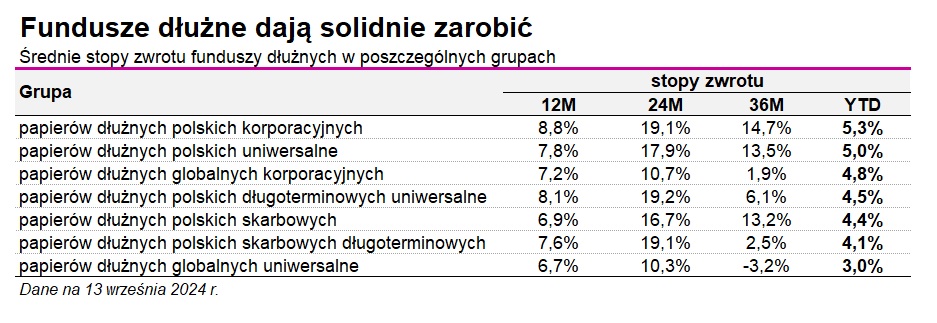 - Rok 2024 będzie świetnym rokiem dla funduszy dłużnych. Nie będzie dla nas zaskoczeniem, gdy na koniec grudnia okaże się, że stopy zwrotu ważone ryzykiem będą na nich wyglądały jeszcze korzystniej na tle akcji - zauważa Kamil Cisowski. - O ile pierwsze półrocze było w ich wykonaniu dość nierówne, jedną z naszych głównych tez inwestycyjnych na drugie było to, że zarówno na rynku krajowym, jak i zagranicznym należy zwiększać durację i myśleć więcej o długu skarbowym długoterminowym. Znajdujemy się w obozie, który nie wierzy, że stopy procentowe pozostaną w Polsce niezmienione dłużej niż do końca pierwszej połowy 2025 r., na całym świecie coraz bardziej widoczna jest dezinflacja, bardzo słabo zachowują się w III kwartale 2024 ceny surowców - dodaje.