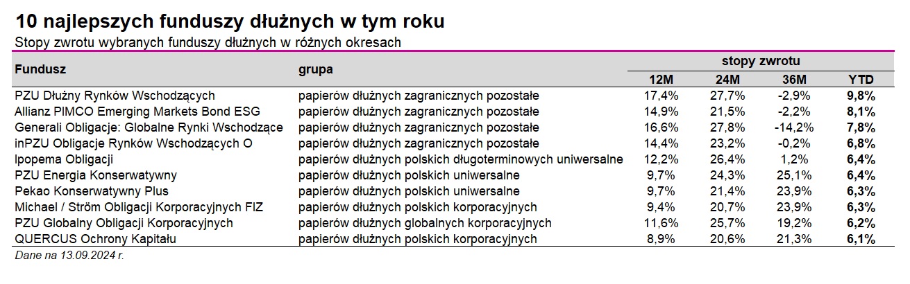 Najlepiej pod względem tegorocznych stóp zwrotu wypada PZU Dłużny Rynków Wschodzących, który od stycznia do 13 września zarobił już 9,8 proc., co jest najlepszym wynikiem na tle wszystkich analizowanych funduszy z segmentu dłużnego (inwestujących w Polsce i za granicą). Fundusz inwestuje głównie w obligacje zagraniczne w tzw. twardych walutach (EUR, USD), które od początku roku zachowywały się wyraźnie lepiej od - chociażby - polskich obligacji skarbowych. Paweł Wróbel, zarządzający funduszami TFI PZU wskazuje także, że portfel jest zabezpieczony przed ryzykiem walutowym za pomocą FX swapów, co również pozytywnie przekładało się na osiągane stopy zwrotu.