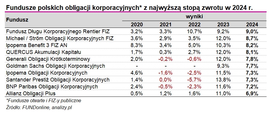 Aktualizacja: Fundusz Ipopema Benefit 3 FIZ AN był zaklasyfikowany do niewłaściwej grupy. Po przeklasyfikowaniu zmianie uległo zestawienie 10 najlepszych w 2024 r. funduszy polskich obligacji korporacyjnych.