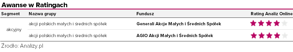 Podczas tego przeglądu ocen ratingowych obydwie podwyżki dotyczą funduszy z grupy akcji polskich małych i średnich spółek. Obok wymienionego w kontekście najwyższej stopy zwrotu w trakcie minionego kwartału funduszu AGIO Akcji Małych i Średnich Spółek do grona funduszy ocenionych na 4 gwiazdki dołączył ponadto Generali Akcji Małych i Średnich Spółek.