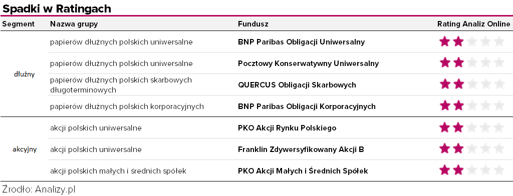Znaczące zróżnicowanie wyników występowało także w ramach segmentu dłużnego. Przeciętnie fundusze dłużne obligacji korporacyjnych dostarczyły zysku +1,3%, zaś w przypadku funduszy papierów dłużnych polskich skarbowych długoterminowych w ujęciu średnim inwestorzy musieli liczyć się w trakcie kwartału ze stratą -1,6%. Ze zmiennym szczęściem do warunków rynkowych dostosowały się także fundusze przez przekrój poszczególnych grup funduszy dłużnych i to w ich przypadku nastąpiło najwięcej zmian w Ratingach.