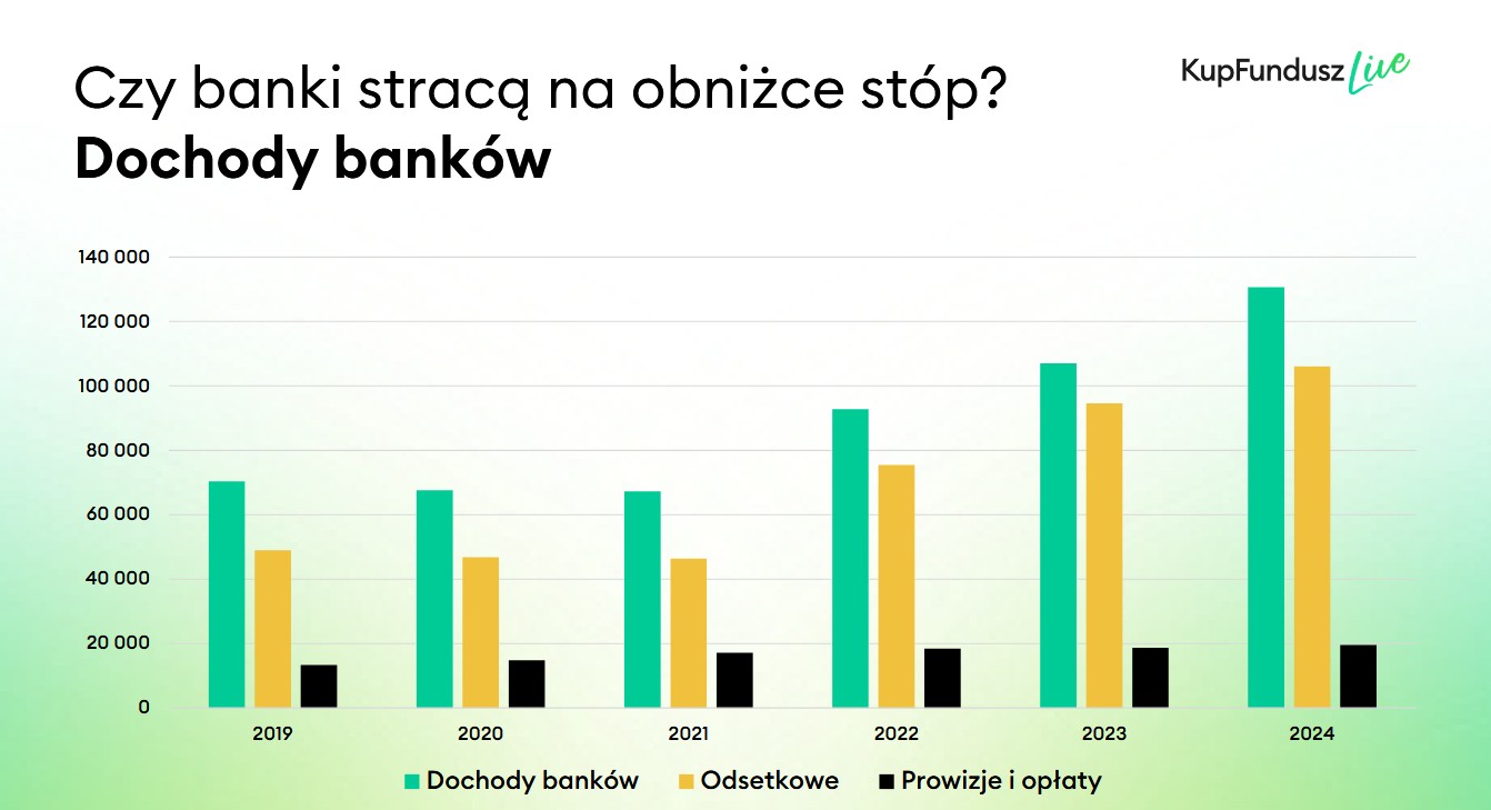 W przypadku polskiej giełdy istotnym sektorem mocno ważącym na wynikach indeksów są banki. Przyjęło się uważać, że obniżki stóp procentowych szkodzą wynikom banków, ponieważ obniżają ich wynik odsetkowy (spada oprocentowanie kredytów opartych na WIBOR-ze). Jednak w tym szczególnym przypadku, czyli sytuacji banków w Polsce w obecnej chwili, nie powinno to być problemem. Wystarczy spojrzeć na dochody banków w kolejnych latach łącznie oraz w podziale na dochody odsetkowe i prowizyjne od 2019 roku. Najmniejsze były w 2021 roku, ale od tej pory rosną. Ponadto banki mogą obniżać oprocentowanie na depozytach, bo mają nadpłynność finansową i nie potrzebują pieniędzy od konsumentów, a ubytek przychodów odsetkowych mogą zostać zrównoważone przez wzrost akcji kredytowej (niższe stopy to większa dostępność tańszych kredytów).