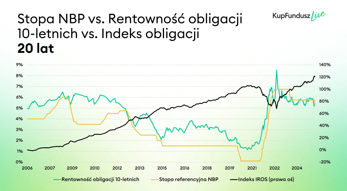 Zacznijmy od rzutu oka na zależność między stopą referencyjną NBP, rentownością 10-letnich obligacji skarbowych i indeksem obligacji IROS przez z ostatnie 20 lat.