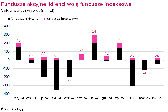 W przeciwieństwie do funduszy aktywnych tu klienci stawiają głównie na fundusze akcyjne, do których w 4 miesiące wpłacili ponad 104 mln zł. Najwięcej nowych środków pozyskały dwa fundusze indeksowe odwzorowujące wyniki indeksu technologicznego Nasdaq-100 i to w wersji lewarowanej za pomocą kontraktów terminowych.