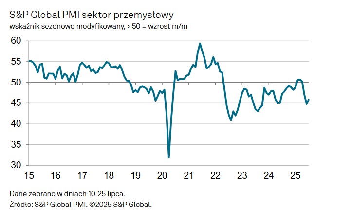 Według najnowszych danych PMI przygotowanych przez S&P Global, w lipcu polski sektor wytwórczy znów wyraźnie się skurczył. Polski PMI wzrósł w lipcu z czerwcowego poziomu 44,8 do 45,9, wykazując kolejne silne pogorszenie warunków gospodarczych w przemyśle. Ogólne tempo spadku spadło, lecz wciąż było wysokie (od połowy 2024 tylko raz było wyższe).