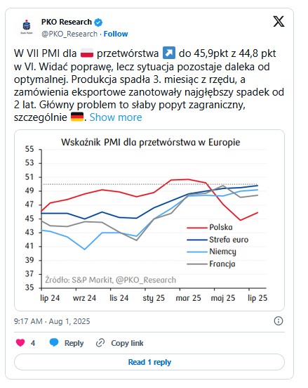 – PMI lekko w górę w lipcu, poziom wskaźnika jest wciąż bardzo niski w stosunku do tego, co pokazują inne europejskie PMI i alternatywne wskaźniki koniunktury dla polskiego przemysłu – dodają eksperci Banku Pekao.
