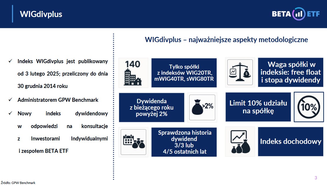 Fundusz naśladuje indeks WIGdivplus, który jest publikowany od 3 lutego 2025 roku i przeliczony do 30 grudnia 2014 roku. Indeks ten uwzględnia spółki z indeksów WIG20TR, mWIG40TR oraz sWIG80TR, które dokonywały wypłaty dywidendy za ostatnie trzy lata lub w czterech z ostatnich pięciu lat obrotowych, przy czym stopa dywidendy w ostatnim roku nie może być niższa niż 2%.