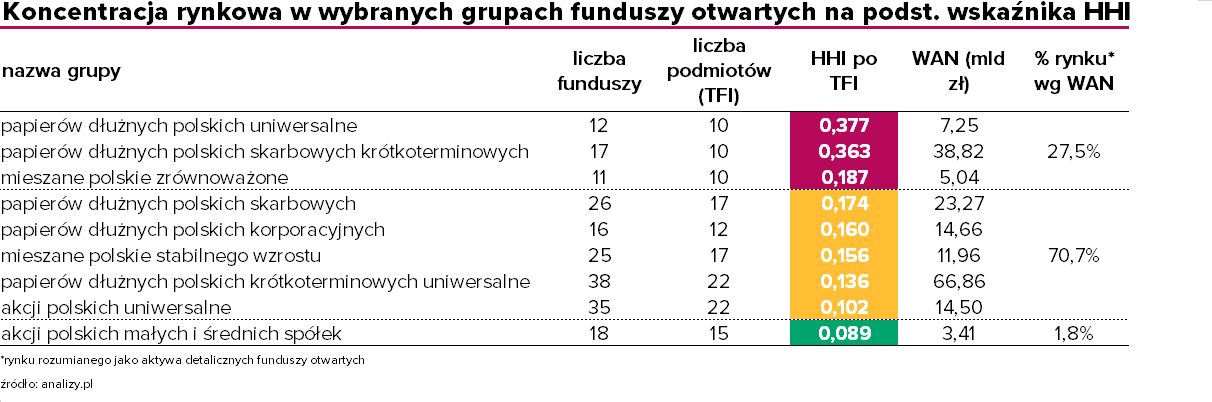 - dotyczy ono struktury rynku, ale nie mówi o tym, czy na pewno idą za tym konkretne zalety dla inwestorów (dobre wyniki, niskie opłaty, reputacja TFI),
