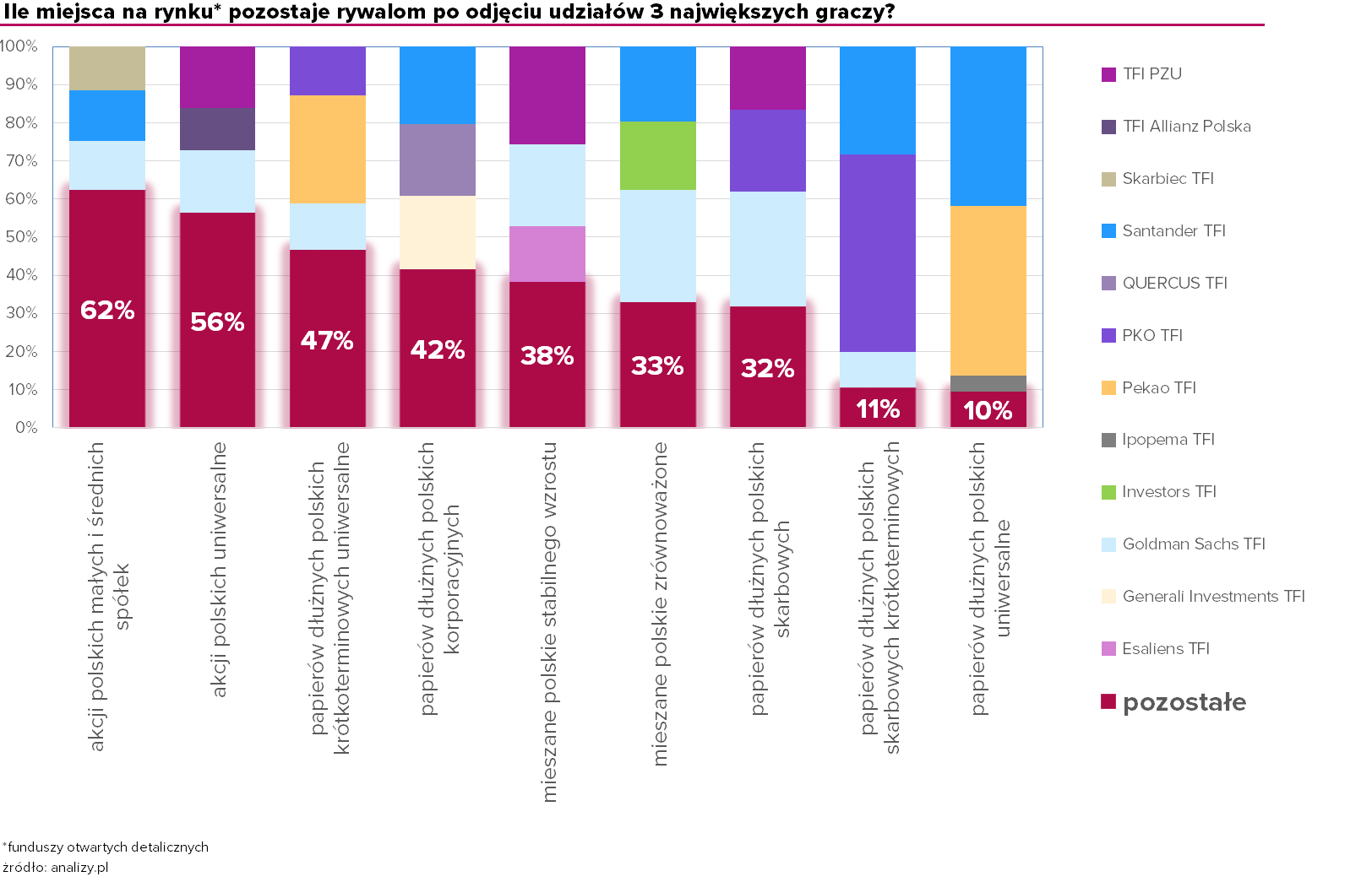 biznes funduszowy to biznes skali, zarabiający na opłatach od wartości aktywów. Najwyższe są do osiągnięcia na funduszach akcyjnych – tu rywalizacja ma szansę najbardziej się opłacać. Z drugiej strony z uwagi na to, że duża część klientów bankowych może nie mieć odpowiednio dużej skłonności do ryzyka, aby inwestować w akcje, bankowe TFI tracą tu trochę na swojej przewadze. Te dwa czynniki mogą odgrywać sporą rolę w dużo bardziej równomiernym podziale „tortu” wśród funduszy akcyjnych względem pozostałych.