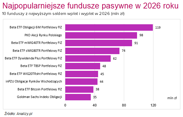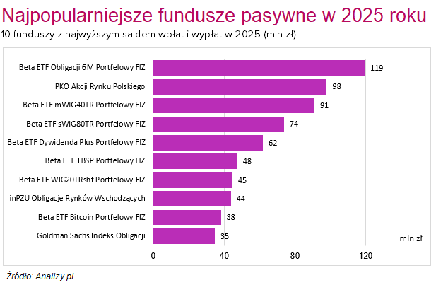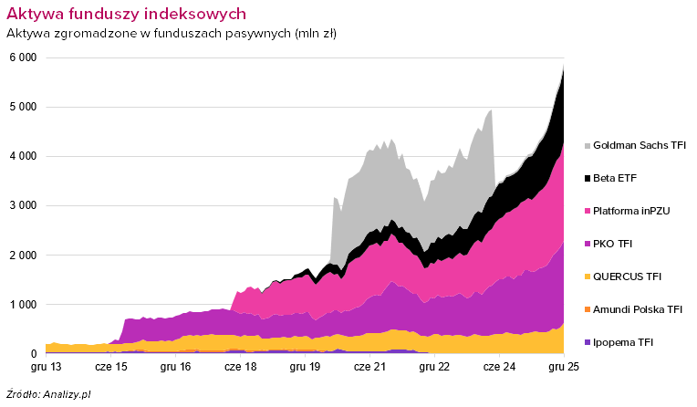 Największy udział w pasywnym torcie utrzymała platforma inPZU z 22 funduszami indeksowymi, przekraczając barierę 2,0 mld zł. Drugie miejsce zajmuje PKO TFI ze swoimi 5 subfunduszami (1,7 mld zł), a trzecie – BETA TFI, która pod skrzydłami AgioFunds TFI jako jedyna polska instytucja oferuje fundusze ETF (1,5 mld zł). W 2025 roku dwie pierwsze instytucje powoli traciły jednak udział w pasywnym rynku na rzecz BETA TFI, która notuje najwyższą dynamikę aktywów. W rok powiększyła aktywa pod zarządzaniem ponad dwukrotnie, zwiększając swój udział z 19% do 26% w grudniu 2025 roku.