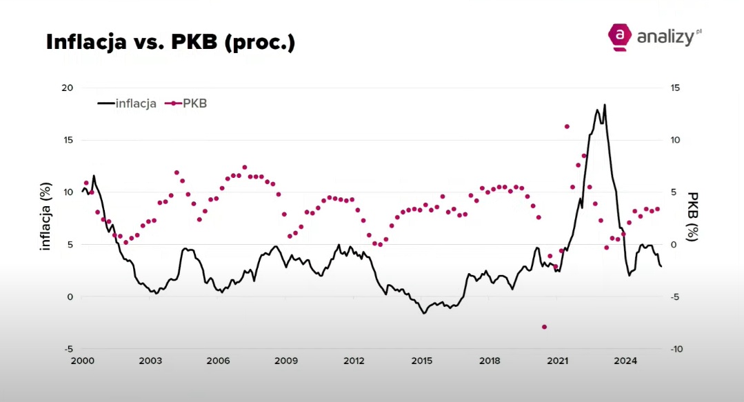 - Jeśli spojrzymy na dane – nawet bez specjalistycznych analiz – łatwo zauważyć, że zanim inflacja zacznie rosnąć, pewne sygnały w gospodarce pojawiają się wcześniej. Gdy gospodarka przyspiesza, inflacja zwykle rośnie; gdy dynamika PKB spada – inflacja z czasem również maleje. Oczywiście nie zawsze ta korelacja jest idealna, ale w dużym uproszczeniu się sprawdza – zauważył Michał Duniec.