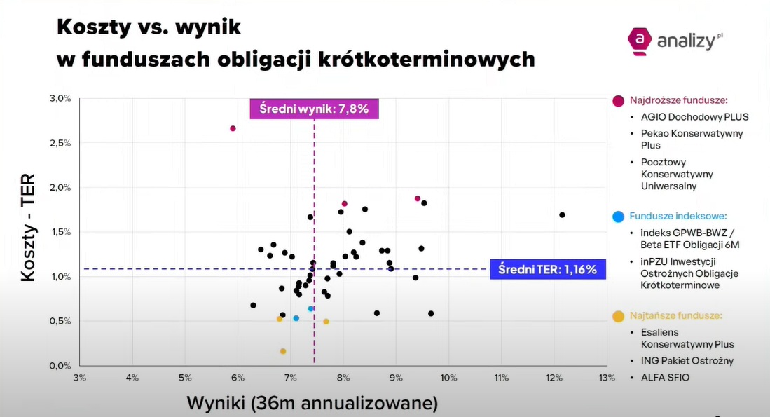 - Pokazują to 36-miesięczne, zanualizowane stopy zwrotu zestawione z kosztami (średni TER w funduszach obligacji krótkoterminowych wynosi 1,16 proc.). Średni wynik w tym okresie to 7–8 proc. rocznie. Fundusze pasywne nie mają trzyletniej historii, więc doliczyliśmy indeks bez kosztów. I widać, że w polskich warunkach nawet fundusze aktywne z wyższymi opłatami potrafią osiągać lepsze wyniki niż średnia – właśnie dzięki stosowaniu strategii niedostępnych dla funduszy indeksowych – wskazał. - To nie jest tak, że droższy fundusz zawsze zarabia mniej, a tańszy – więcej. W przypadku funduszy akcyjnych taka prawidłowość zwykle występuje, ale na rynku obligacji krótkoterminowych ona się po prostu nie potwierdza – dodał.