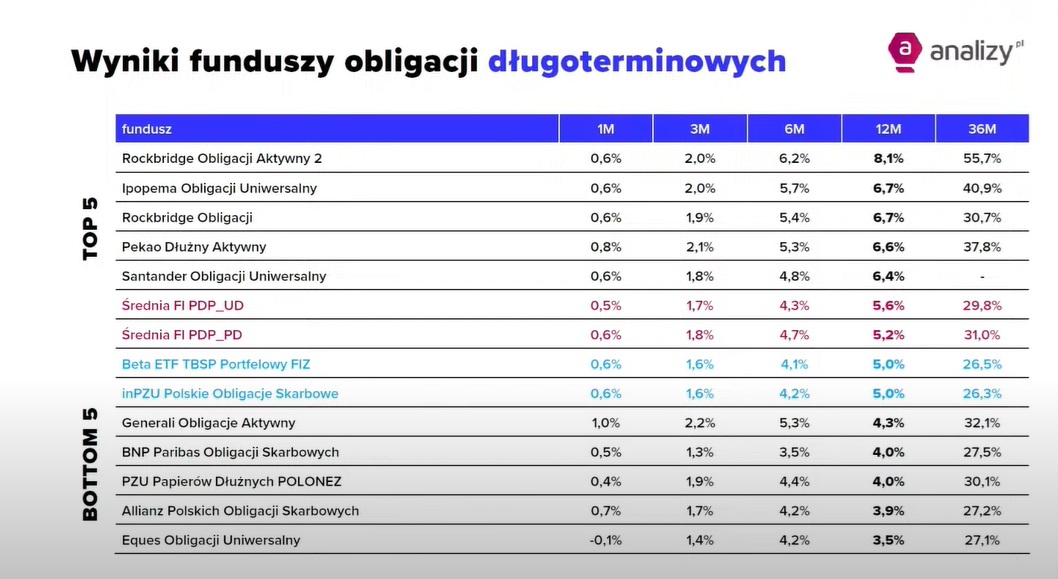 - W ostatnich latach najlepsze fundusze obligacji długoterminowych wypracowały wyniki powyżej średniej, także często stosując bardziej zaawansowane strategie. Najsłabsze znalazły się poniżej średniej – czasem z powodu mniejszej skłonności do ryzyka, czasem dlatego, że zarządzający po prostu się pomylili. Fundusze indeksowe z tej grupy, jak zawsze, wypadają zgodnie z założeniem – osiągają wyniki bliskie indeksowi, pomniejszone o koszty, z niewielkimi odchyleniami – zauważył Michał Duniec.
