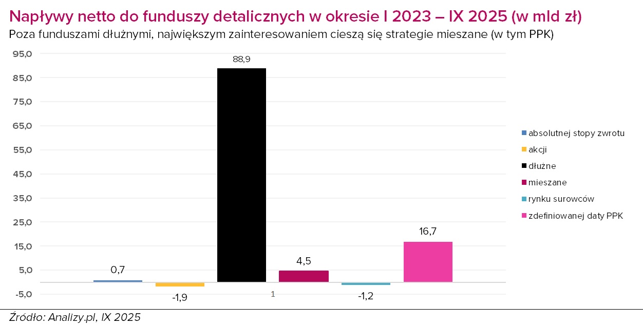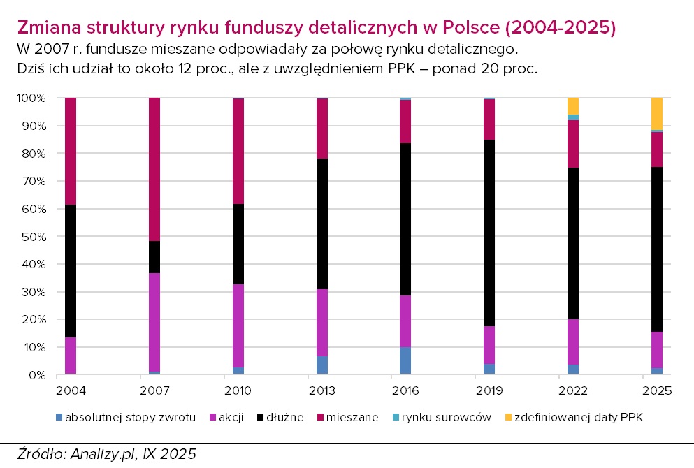 W praktyce jednak segment funduszy mieszanych jest znacznie szerszy. Do tej grupy można bowiem zaliczyć także fundusze cyklu życia, wykorzystywane w programie PPK, które z definicji łączą różne klasy aktywów, dopasowując ich proporcje do wieku uczestnika. W samych TFI zgromadziły one już 36 mld zł. Jeżeli dodać do tego również fundusze absolutnej stopy zwrotu (7 mld zł) – zarządzane w formule przypominającej fundusze mieszane – łączna wartość aktywów strategii o takim profilu przekracza dziś 82 mld zł. To stanowi jedną czwartą rynku detalicznego i około jedną piątą całego rynku funduszy inwestycyjnych w Polsce. W ujęciu nominalnym to najwyższy poziom w historii.