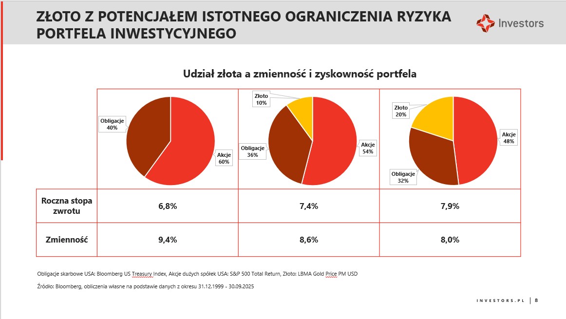 Złoto reaguje niezależnie od innych klas aktywów, co czyni je niezwykle cennym dywersyfikatorem, szczególnie w trudnych okresach rynkowych. Dodanie złota do portfela obniża jego całkowitą zmienność przy jednoczesnym potencjalnym wzroście stopy zwrotu.