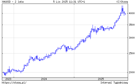 W bieżącym roku złoto do październikowego szczytu zyskało prawie 67%. Od końca 2023 roku złoto do szczytu zyskało 123%. Obecnie notowane jest o prawie 10% niżej niż w październikowym szczycie.