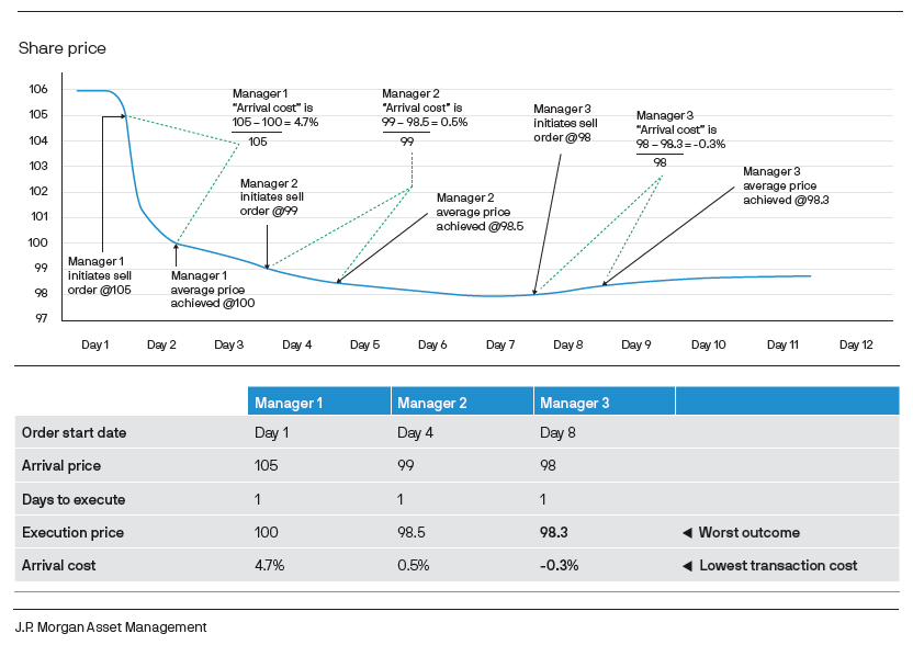 Zarządzający 2 sprzedaje trzy dni później. Zaczyna z ceną 99, a kończy ze średnią ceną realizacji 98,5 (arrival price – 99, execution price – 98,5 → koszt przybycia – 0,5%).