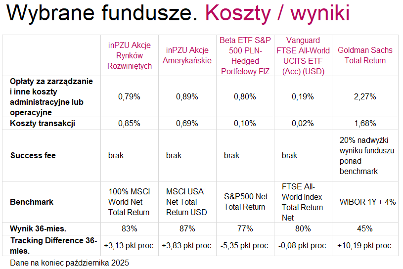 W funduszach inPZU koszty bieżące wynoszą 0,79% i 0,89%; koszty transakcyjne – od 0,69% do 0,85%. W Beta ETF-ie łączne koszty wynoszą 0,9%, w ETF-ie Vanguarda - 0,21%, a w funduszu aktywnym – łącznie 3,95%.