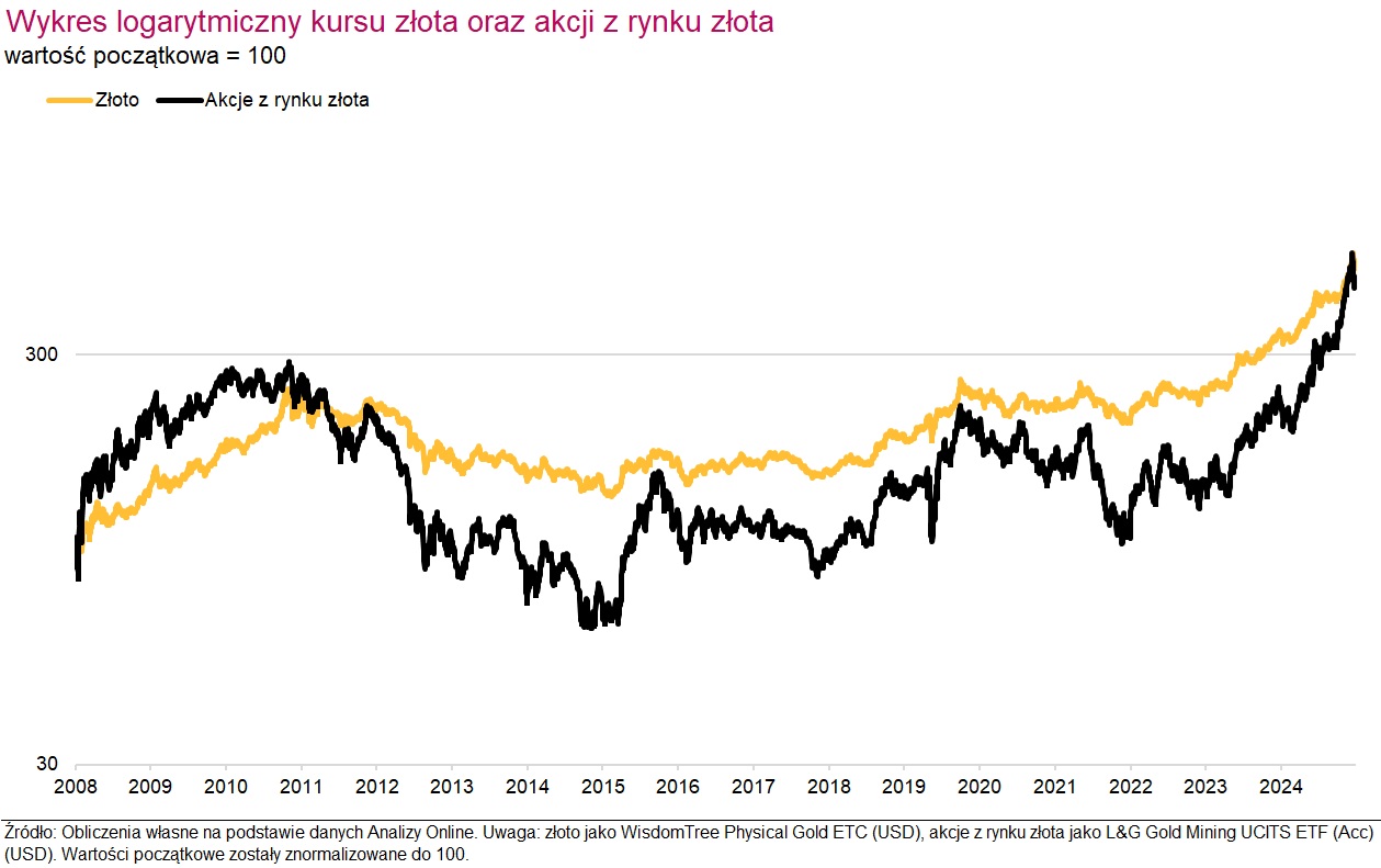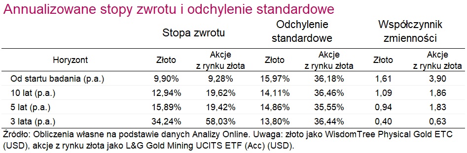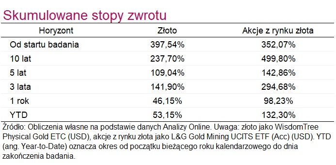 Niemniej, inwestor gotowy ponieść większe ryzyko i decydujący się na akcje z rynku złota ma realną szansę na osiągnięcie lepszych wyników w porównaniu do stopy zwrotu ze złota – jest to jednak typowy miecz obosieczny.