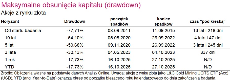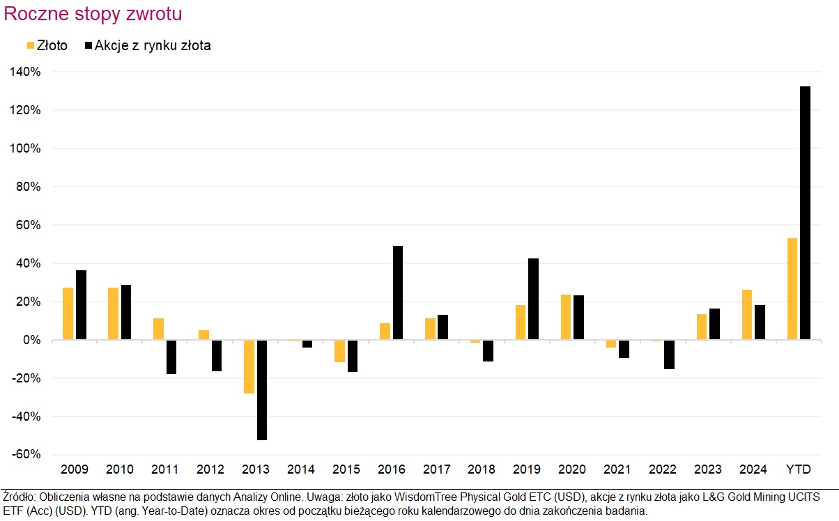 Analizując stopy zwrotu za poszczególne lata, można zauważyć, że zarówno najsłabszy, jak i najmocniejszy rok dla tych dwóch kategorii pokryły się. Były to odpowiednio lata 2013 i 2025 (tu mowa o stopie zwrotu YTD). W obu przypadkach uwidocznił się efekt dźwigni operacyjnej – spadki były głębsze, a wzrosty mocniejsze przy akcjach z rynku złota.