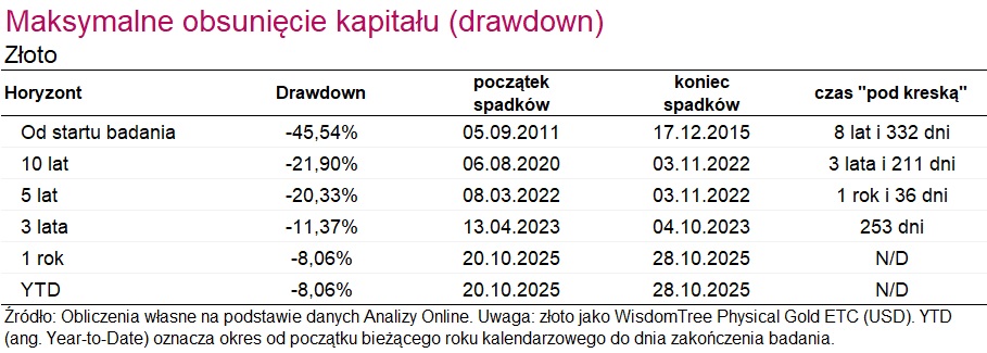 Jeśli chodzi o analizę ryzyka, warto uzupełnić ją o wskaźnik maksymalnego obsunięcia kapitału, czyli tzw. drawdown. Zaletą tego wskaźnika, w przeciwieństwie do odchylenia standardowego, jest to, że znacznie lepiej uwidacznia ryzyko zdarzeń skrajnych. Przyjrzyjmy się temu bliżej.