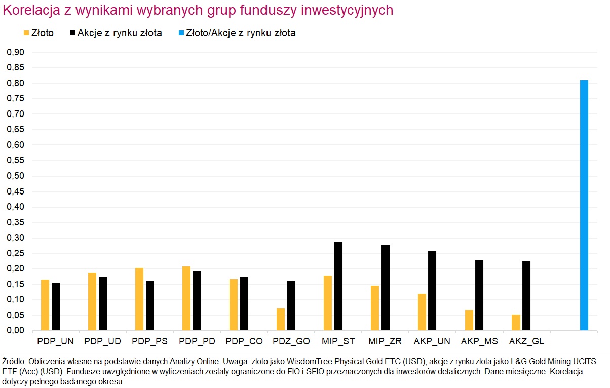 Przy podejmowaniu decyzji o włączeniu do portfela ekspozycji na rynek złota, kluczowe są nie tylko wyniki i ryzyko, ale także korelacja stóp zwrotu z innymi klasami aktywów. To właśnie ta zależność określa użyteczność złota/spółek z rynku złota jako elementu dywersyfikującego. Jak się okazuje, korelacja, zarówno złota, jak i akcji z rynku złota, z wynikami popularnych grup funduszy inwestycyjnych jest znacząco niska – mieści się w przedziale 0,0-0,3. Z perspektywy dywersyfikacji portfela jest to dobra wiadomość. Dla porównania korelacja wyników złota i akcji z rynku złota wynosi mocne 0,8.