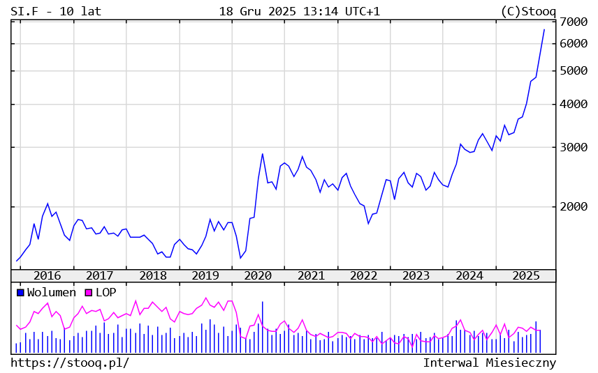 W 2025 roku srebro zyskało ponad 126%, imponując zwłaszcza dynamicznym rajdem w końcówce roku. Jego cena w grudniu przekraczała 66 dol. za uncję.