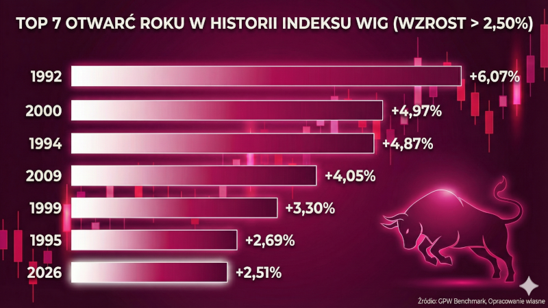 Wynik z 5 stycznia 2026 roku plasuje się w czołówce historycznych otwarć roku na GPW. Analiza historyczna pokazuje, że silne początki roku często zbiegały się z kluczowymi momentami dla rynku kapitałowego.