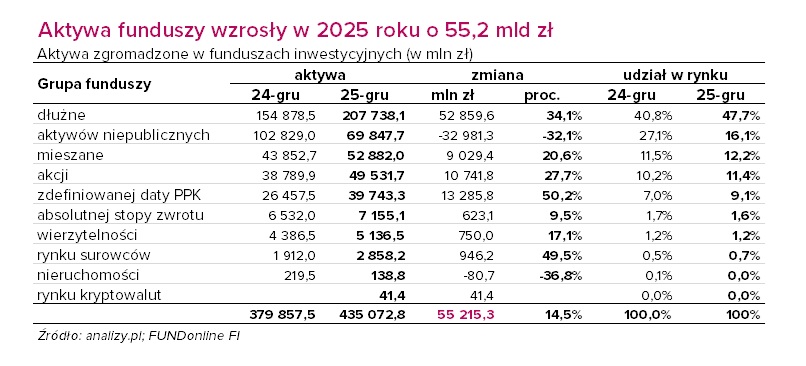 W 2025 roku fundusze dłużne umocniły swoją pozycję rynkowego lidera, zwiększając aktywa pod zarządzaniem do 207,7 mld zł (+52,9 mld zł, +34,1 proc. r/r). Fundusze dłużne mają obecnie 47,7-proc. udział w rynku funduszy (kapitałowy i niepubliczny). Dziesięć najpopularniejszych pod względem napływów funduszy w 2025 r. to właśnie rozwiązania dłużne, które pozyskały łącznie niemal 23 mld zł netto. To prawie 48 proc. środków, które w omawianym okresie trafiło do funduszy detalicznych ogółem (48,2 mld zł).