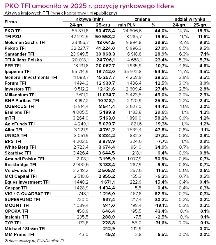 W ujęciu nominalnym największy przyrost aktywów miało PKO TFI – aż o 24,6 mld zł (44 proc. r/r). To tyle ile Goldman Sachs TFI (9,9 mld zł), Pekao TFI (9 mld zł) i PZU TFI (8,3 mld zł) razem wzięte. W 2025 roku do funduszy PKO TFI w segmencie detalicznym trafiło na czysto ponad 16,6 mld zł, najwięcej na rynku. Na koniec ubiegłego roku PKO TFI miało pod zarządzaniem łącznie (rynek kapitałowy i niepubliczny) rekordowe 80,5 mld zł aktywów.
