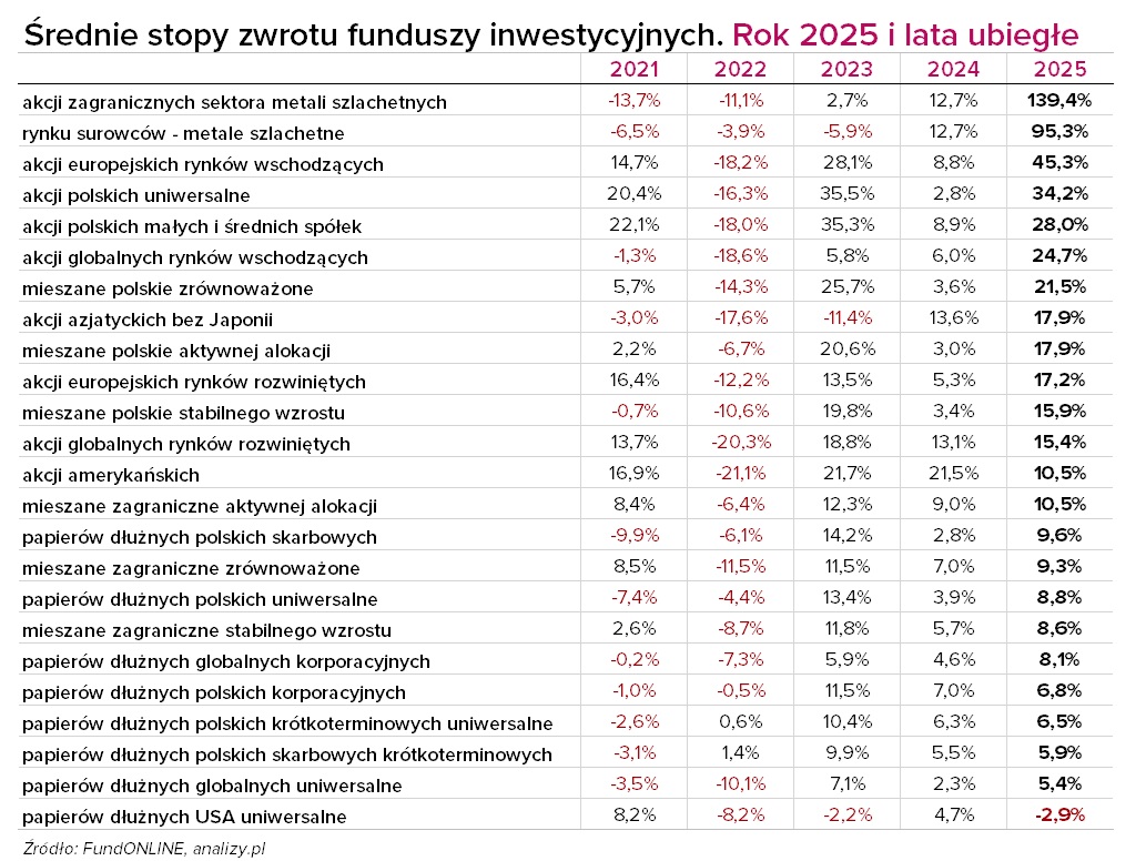 Rok 2025 był trzecim z rzędu bardzo udanym dla klientów TFI. Zdecydowana większość funduszy inwestycyjnych zakończyła rok z dodatnimi stopami zwrotu, często liczonymi w dwucyfrowym, a w wybranych segmentach nawet trzycyfrowym tempie. Szacujemy, że w całym 2025 r. fundusze zarobiły dla swoich klientów łącznie aż 36,5 mld zł, wyraźnie więcej niż w 2024 r. (ok. 13 mld zł) i więcej niż w rekordowym dotąd 2023 r. (27 mld zł). Na tle poprzednich lat 2025 rok wyróżniał się nie tylko skalą zysków, ale także zmianą liderów hossy. Choć globalne rynki akcji zakończyły rok solidnymi wzrostami, tym razem Wall Street nie była głównym źródłem ponadprzeciętnych wyników. Znacznie lepiej radziły sobie wybrane rynki poza USA, w tym warszawska giełda, a prawdziwym fenomenem okazały się metale szlachetne. To właśnie strategie oparte na złocie i srebrze odpowiadały za największą część spektakularnych stóp zwrotu w całej branży. Fundusze dłużne po raz kolejny potwierdziły swoją konkurencyjność wobec lokat bankowych. Jedynym wyraźnym wyjątkiem pozostawały fundusze obligacji amerykańskich, które jako jedyna grupa zakończyły rok stratą w ujęciu średnim.