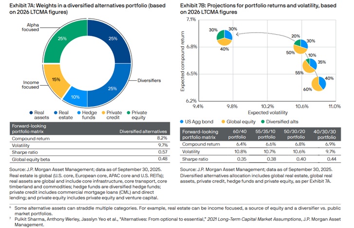 Z wyliczeń JPMorgan Asset Management wynika, że dodanie zdywersyfikowanych alternatyw może poprawić parametry klasycznego portfela 60/40, czyli mieszanki 60 proc. akcji i 40 proc. obligacji. Alokacja 10-30 proc. w alternatywy podnosi oczekiwaną roczną stopę zwrotu o 0,2-0,5 pkt proc., a jednocześnie obniża zmienność, co przekłada się na wyższy wskaźnik Sharpe’a.